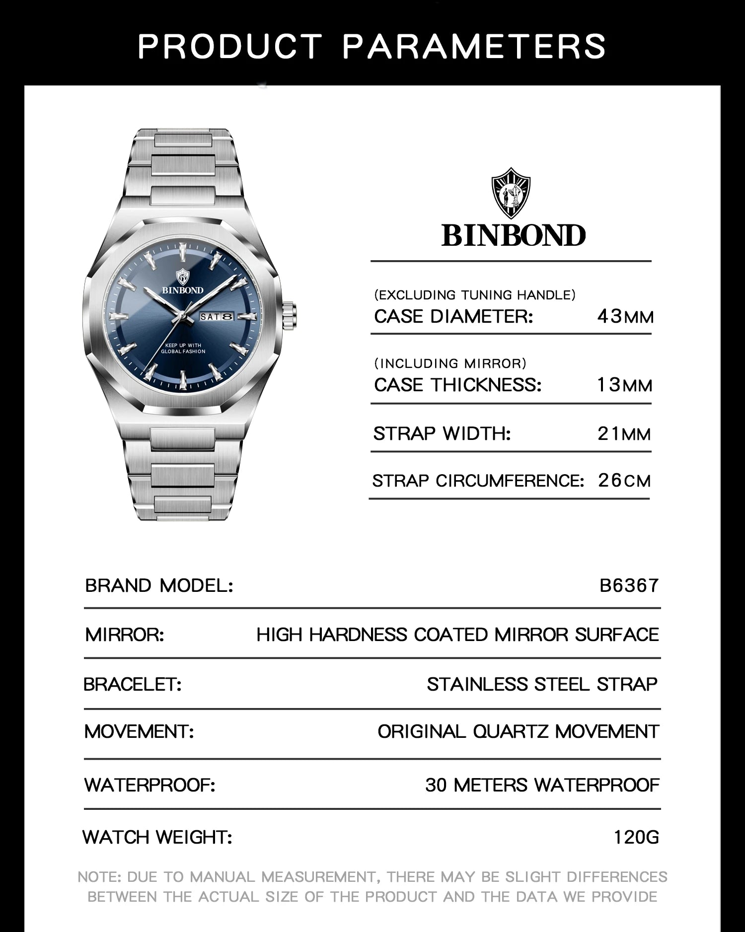 BINBOND Fashionable Men's Quartz Watch Dual Calendar Night Light Waterproof Trend Casual Business Sports Male Quartz Wristwatch