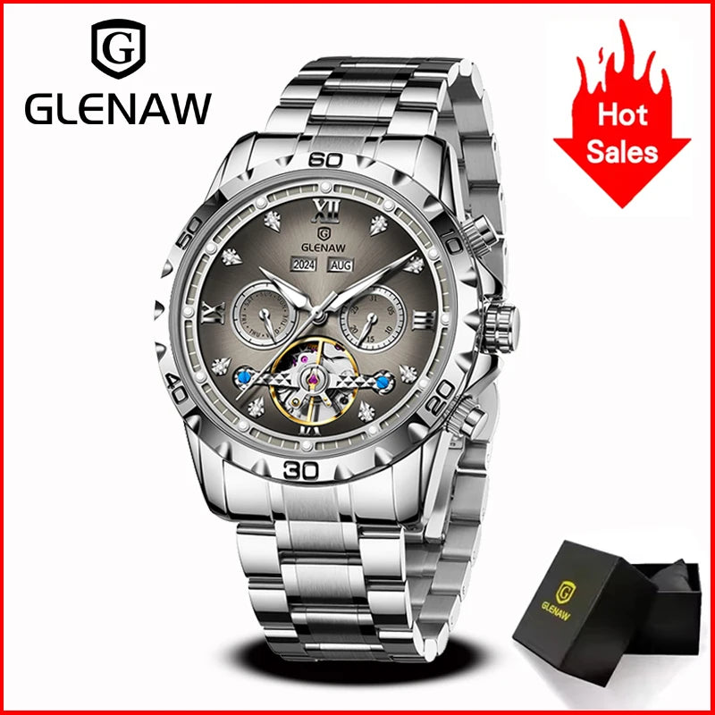 GLENAW NEW Year Month Sunday Multi-functional Mechanical Watch Men luxury Stainless Steel Waterproof Automatic watch steel strip