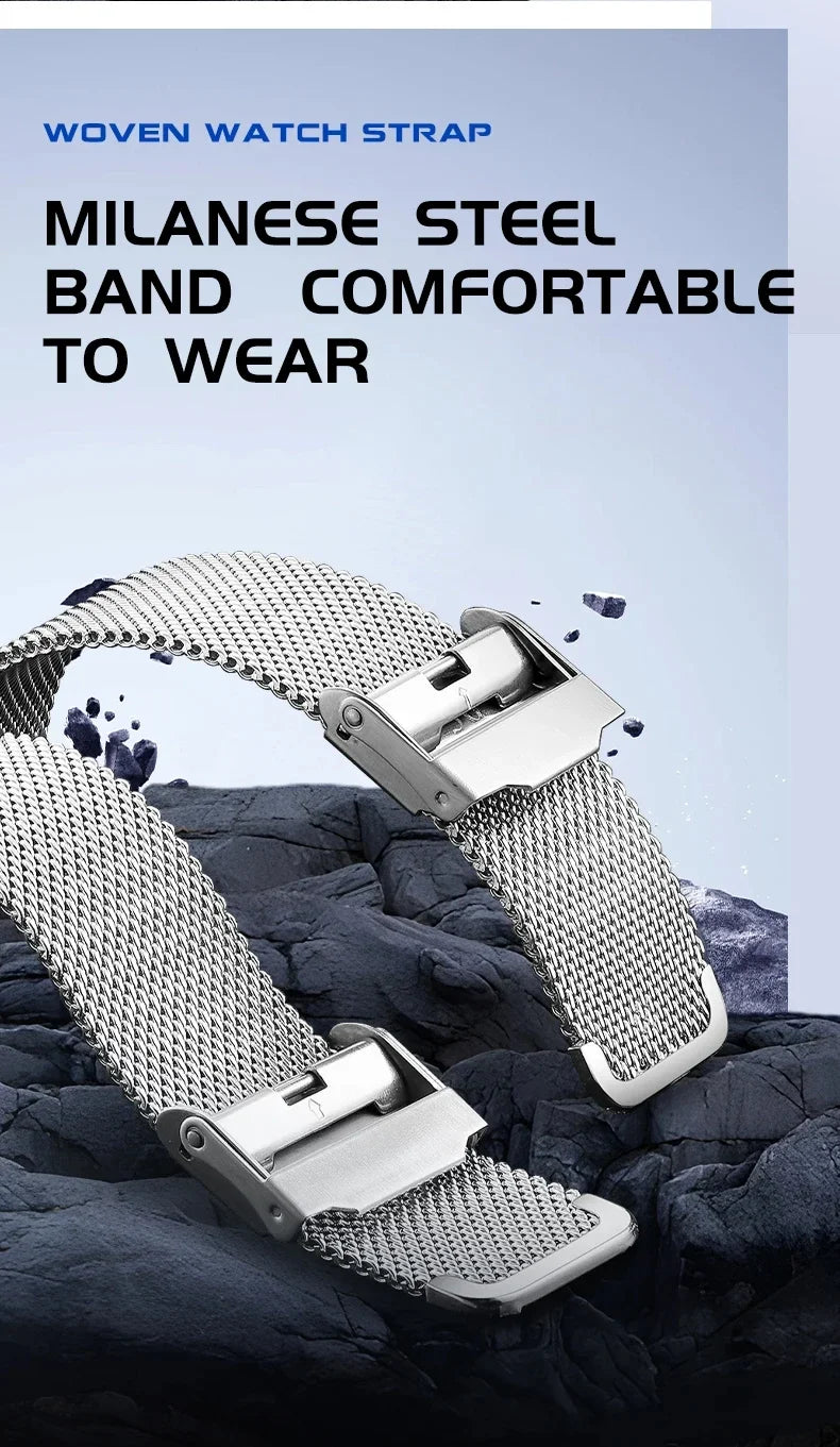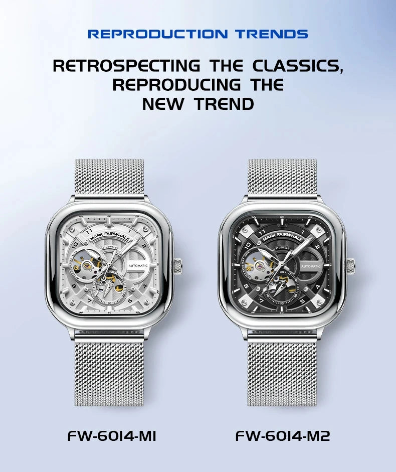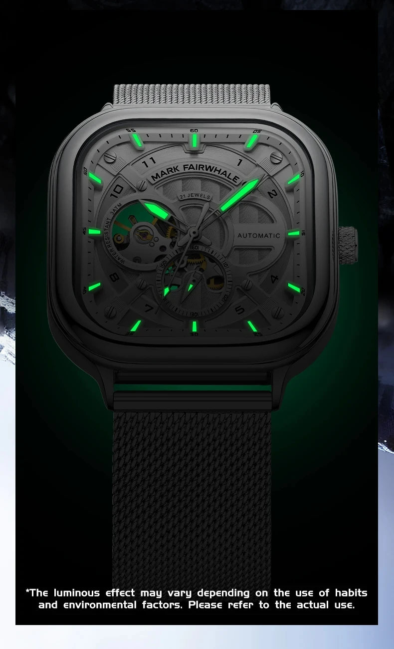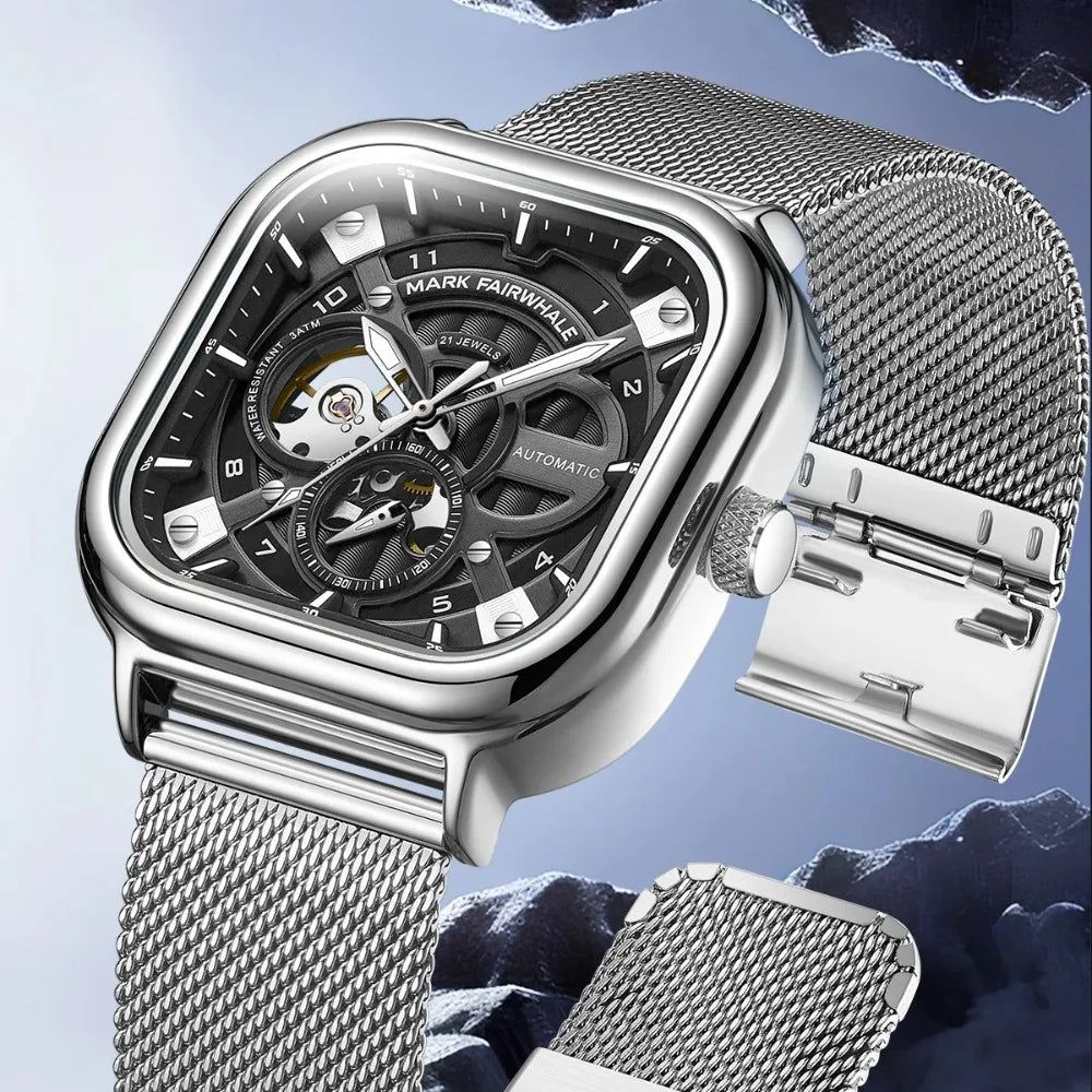 Mark Fairwhale 6014 Men's Automatic Movement Mechanical Watch Square Dial Stainless Steel Waterproof Mesh Strap Watches for Men